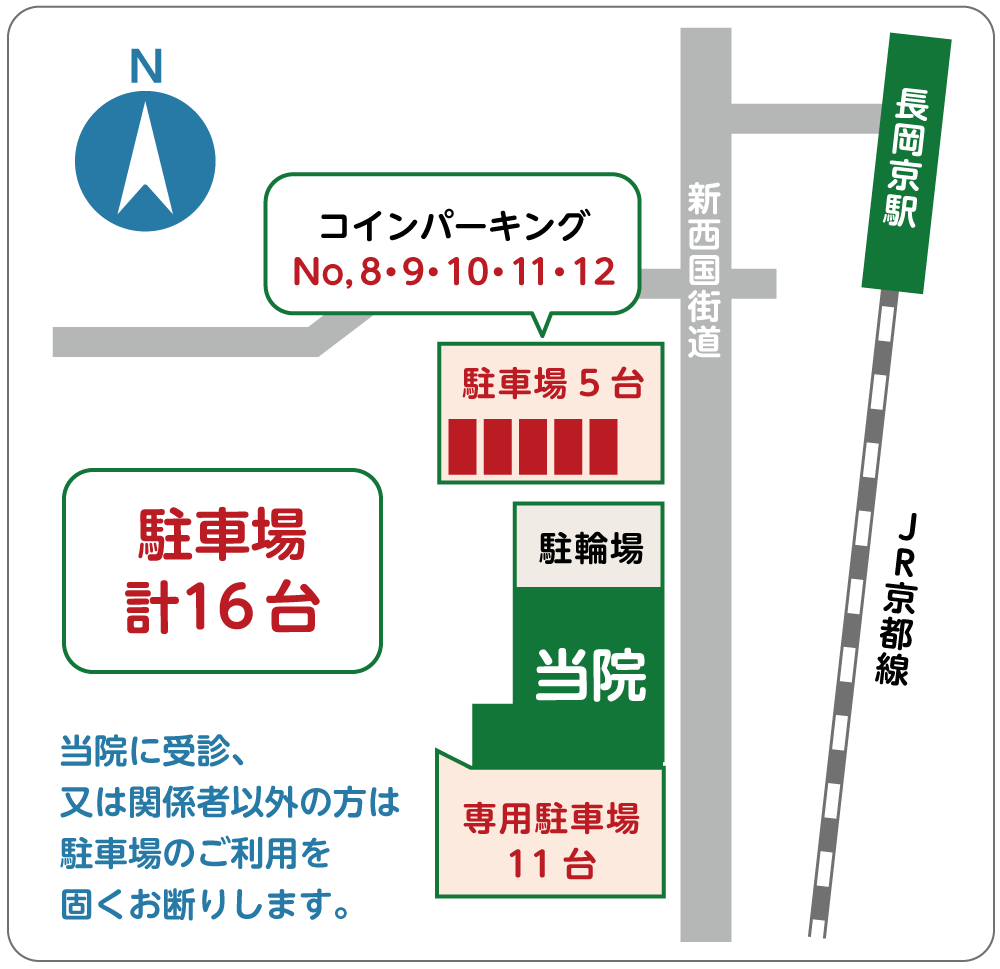お車でお越しの方は新設の専用駐車場11台とコインパーキング5台をご利用ください。